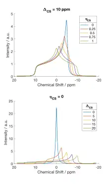 Fitting of the pattern in a static ssNMR experiment gives information about the shielding tensor, which are often described by the isotropic chemical shift , the chemical shift anisotropy parameter , and the asymmetry parameter .[5]