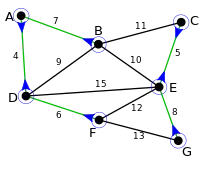 {A,B,C,D,E,F,G} In the second and final iteration, the minimum weight edge out of each of the two remaining components is added. These happen to be the same edge. One component remains and we are done. The edge BD is not considered because both endpoints are in the same component.