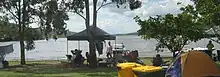 There are two public access areas on Somerset Dam, Kirkleigh and The Spit. Both locations have multi-lane, concrete boat ramps with facilities for day-trippers.[9] Camping is permitted and caravans are catered for at Kirkleigh and below the dam wall at Somerset Park in the small town of Somerset Dam. During busy periods the two camping locations can be filled to capacity with room for a maximum of 2,200 campers at Kirkleigh and 800 at Somerset Park.[10] Lake Somerset Holiday Park's Kirkleigh campground also features cabin accommodation at the waterfront and direct access to the dam from a grassy spit.[11] The dam contains 30 kilometres (19 mi) of navigable waterway.[9]