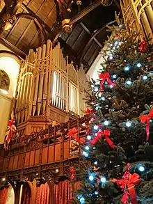 The Disruption of 1843 caused an inevitable loss of congregation. However the church recovered and reconstruction and restoration of the building took place 1847–48. The architect was Thomas Hamilton.[4] The layout of the old church was retained, and the nave arcade and the lower part of the aisle walls are original. The aisle roofs were lowered, and the tracery of the windows replaced. A new square tower was built at the NW. Inside there is a magnificent hammerbeam nave roof said to be based on St Isaac's in St Petersburg.[13]:457–459 The west window was salvaged and re-used at St Conan’s Kirk.[14] The church is a category A listed building.[15]