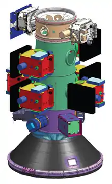 Included was COSMIC-2, a cluster of six satellites, with a mass of 277.8 kg (612 lb) each.[13] The primary role of the COSMIC-2 satellite constellation is to provide radio occultation data with an average latency of 45 minutes. The six satellites were placed on an orbit with an inclination of 24° to 28.5° with plans for them to move eventually to six separate orbital planes with 60° separation between them.[14] The payload stack was integrated using an ESPA ring. Two ESPA Grande rings were used to mount the six COSMIC-2 satellites beneath the upper payload adapter hosting the DSX payload and avionics modules.[15]