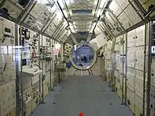 Spacelab consisted of a variety of interchangeable components, with the major one being a crewed laboratory that could be flown in the Space Shuttle orbiter's bay and returned to Earth.[8] However, the habitable module did not have to be flown to conduct a Spacelab-type mission and there was a variety of pallets and other hardware supporting space research.[8] The habitable module expanded the volume for astronauts to work in a shirt-sleeve environment and had space for equipment racks and related support equipment.[8] When the habitable module was not used, some of the support equipment for the pallets could instead be housed in the smaller Igloo, a pressurized cylinder connected to the Space Shuttle orbiter crew area.[8]