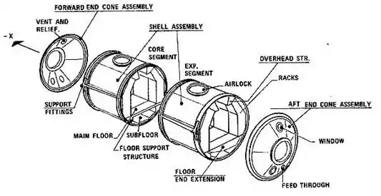 The habitable Spacelab laboratory module comprised a cylindrical environment in the rear of the Space Shuttle orbiter payload bay, connected to the orbiter crew compartment by a tunnel. The laboratory had an outer diameter of 4.12 m (13.5 ft), and each segment a length of 2.7 m (8 ft 10 in). The laboratory module consisted at minimum of a core segment, which could be used alone in a short module configuration. The long module configuration included an additional experiment segment.[10] It was also possible to operate Spacelab experiments from the orbiter's aft flight deck.[10]