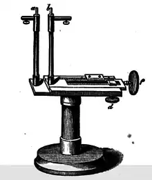 The spark micrometer, also known as a Riess micrometer[1] was a device used by 19th century physicists to measure potential in an electric circuit. It was developed principally by German physicist Peter Riess. It consisted of two electrodes very close together, one of which was attached to a micrometer screw with a calibrated dial, so by turning a knob the width of the gap could be adjusted very precisely. From Paschen's law, the distance between two electrodes when a spark just jumped across a gap was proportional to the potential difference (voltage) between the electrodes, so a spark micrometer could serve as a crude voltage measuring instrument, by widening the gap until the voltage was just able to jump across.