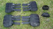 Brushing boots or splint boots are used to protect a horse's legs during exercise, protecting the lower leg from injury that may occur if one leg or hoof strikes the opposite leg. They are commonly seen on horses in fast work, such as jumping, when in training, such as when longeing, or in competitions such as reining or eventing. Brushing injuries are more common on the forelegs, when one hoof catches the other leg, or when the fetlock or cannon bones hit each other. This can cause a serious injury on a horse's legs, especially if the horse is wearing shoes.[1] Poor equine conformation can often lead to brushing, although even properly-conformed horses can also accidentally injure themselves. Brushing boots may also be placed on horses in the field to protect them if they get overly excited. Other reasons for use may include placement on a young or unfit horse which may be excitable and step on itself, or on horses subject to intense work that may stumble more if they are tired.