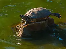 The lake also supports a fairly robust colony of turtles of various species. Most appear to be red-eared sliders, a non-native species originally from the southern United States that was extremely popular as a children's pet. At least a couple turtles living in the lake do not display the red markings typical of the red-eared slider and may be western painted turtles, a native species. There is at least one large (12 to possibly 14-inch) soft shelled turtle of unknown species also living in the lake. Most of the turtles were probably introduced to the lake as discarded pets though a thriving population of turtles was noted as far back as 1912.