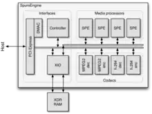 The SpursEngine is a stream processor powered by four Synergistic Processing Elements (SPE),[2] also used in the Cell processor featured in Sony PlayStation 3. These processing elements are fed by on chip H.264 and MPEG-2 codecs and controlled by an off die host CPU, connected by an on chip PCIe controller[2] (in contrast to the Cell processor which has an on chip CPU (the PPE) doing similar work). To enable smoother interaction between the host and the SpursEngine Toshiba also integrated a simple proprietary 32-bit control core. The SpursEngine employs dedicated XDR DRAM as its working memory.[2]