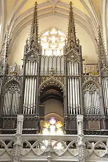 During this time, the late-Gothic St Joseph's Chapel was completely removed. A neo-Gothic flèche was also added. Steindl's plan was to rebuild all the neo-Gothic components of the cathedral, but this was denied by the commission who instead requested that old stone constructions be replaced with new ones. Rebuilding the towers in the Gothic style was not realized largely due to a lack of funds, which was also reflected in the use of cheaper construction material. For structural repairs between 1878 and 1882, cheap but low-quality sandstone from the nearby Spiššké Vlachy stone pit was used.[15] This stone quickly degraded and resulted in the removal of pinnacles and gargoyles from the outer surface because they endangered pedestrians. In the next phase of reconstruction beginning in 1882, higher quality sandstone from Banská Bystrica was used.[14]