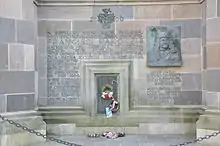 Above the relief are placed five frame reliefs decorated by pinnacles and profiled and traceried motives. Two lower framed reliefs refer to the life of St Elizabeth. The other three recreate the scene from Calvary.