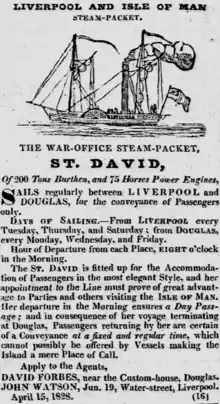 The St David which was fairly small and slower than her rivals was offered for sale in the spring of 1828, however no interest was expressed in a purchase and she resumed plying to Douglas in April of that year.[3][2] Although she was operated by the St George Group (see establishment) at this time her sailing notices appear under the name of John Watson, 19 Water Street, Liverpool, and the St George Steam Packet Offices are listed as being at 21, Water Street. This fact is important as it may be seen as a reason as to why the vessel came into disrepute, due to subsequent lack of investment and poor maintenance, this being one of the primary factors which would lead to the establishment of the Isle of Man Steam Packet Company in 1830.[3][2]
