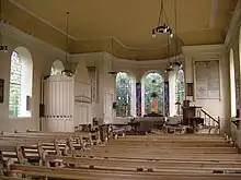 The church's font dates from the 13th century, while most of the other fittings date from an 1874 refurbishment, which gave the interior a Gothic appearance. The pulpit and altar furnishings were carved in 1910 by Robert Thompson. In the 1970s, Victorian stained glass windows were replaced with clear glass.[1][3]