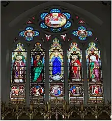 Inside the church, the high altar and reredos date from 1865, and were probably designed by E. W. Pugin. They were separated in 1948–50 by Weightman and Bullen, who placed the reredos against the east wall. The stained glass in the east window dates from 1878, and is a typical design by the Belgian stained glass painter Jean-Baptiste Capronnier.[3] The two-manual pipe organ was built by Franklin Lloyd in 1895, and is situated in a gallery on the north wall of the church at the west end.[6]