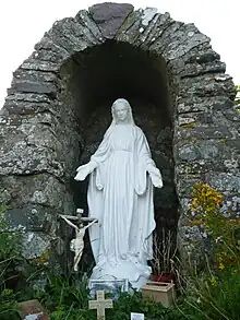A holy well close to the chapel (51°52′21″N 5°16′06″W / 51.872455°N 5.268365°W / 51.872455; -5.268365 (Chapel of Our Lady and St Non, Pembrokeshire)) was thought to have healing properties,[7] and to this day visitors throw coins into the well for luck. Records of a survey of St. David's by Browne Willis in 1717 state that "there is a fine Well beside it [St. Non's Chapel], cover'd with a Stone-Roof, and enclos'd within a Wall, with Benches to sit upon round the Well. Some old simple People go still to visit this Saint at some particular Times, especially upon St. Nun's Day (March 2nd) which they kept holy, and offer Pins, Pebbles, Etc at this well",[8] and reports from 1811 state that "the fame this consecrated spring has obtained is incredible and it is still resorted to for many complaints". It was thought to be particularly effective for eye problems and was restored in 1951 by the Catholic Church, which also erected a shrine using stones from nearby ruins. The vaulting over the well replaced ruins of medieval stonework in the 18th century.[9] Water from the well was used by Pope Benedict during his visit to Britain.[10]