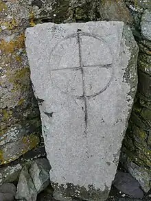 A large stone standing in the corner of the ruined chapel, inscribed with a cross within a circle, is known as St Non's Cross. The stone was found in the same field as the chapel and is either a grave or an altar stone.[4] The stone is dateable to the 7th to 9th century, but there is no firm evidence that it originally came from the site.[5]