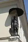"City Gatekeeper" (Lithuanian: "Miesto vartų sargybinis") is a 1973 diploma work by Kuzma for his graduation from the Vilnius Art Institute. It is located in a niche of the Umiastowski Palace at the corner of Trakų and Pylimo Streets in Vilnius Old Town. Initially it was a decorative piece made of wood; now it is made of copper. It is a "talking sculpture"; narration by Arūnas Sakalauskas can be listened to by a smartphone after scanning the QR code or entering the URL specified on the tablet at the pedestal of the sculpture. Kuzma modelled the face of the sculpture after his friend, graphic artist Rimtautas Gibavičius.[8]