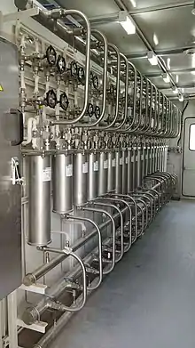 Sample conditioning system in some countries is also called sampling system, Wet Panel or Wet Rack. This is intended to house various components for sample conditioning. This may be an open rack or a closed enclosure with a corridor in between.[2] The system contains sample conditioning equipment and a grab sampling sink. In this system stage, sample is first cooled in Sample Coolers, depressurized in Pressure Regulator[3] and then fed to various analyzers while the flow characteristics is kept constant by means of Back Pressure Regulator.