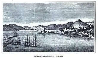 The fighting between the squadrons and the bombarding of Tripoli lasted three hours, with Preble's squadrons emerging victorious.[75] However, success and promotion were overshadowed by an unfortunate turn of events for Decatur. During the fighting Decatur's younger brother, James Decatur, in command of a gunboat, was mortally wounded by a Tripolitan captain during the boarding of a vessel feigning surrender.[76][77] Midshipman Brown, who was next in command after James, managed to break away from the ambushing vessel and immediately approached Decatur's gunboat bringing the news of his brother's fatal injury. Decatur had just captured his first Tripolitan vessel and upon receiving the news turned command of his captured prize over to Lieutenant Jonathan Thorn and immediately set out to avenge his brother's treacherous injury.[78][79] After catching up with and pulling alongside the Tripolitan ship, Decatur was the first to board the enemy vessel with Midshipman Macdonough at his heels along with nine volunteer crew members. Decatur and his crew were outnumbered 5 to 1 but were organized and kept their form, fighting furiously side by side.[80] Decatur had little trouble singling out the corsair captain, the man responsible for James' mortal wound, and immediately engaged the man. He was a large and formidable man in Muslim garb, and armed with a boarding pike he thrust his weapon at Decatur's chest. Armed with a cutlass Decatur deflected the lunge, breaking his own weapon at the hilt.[81] During the fight Decatur was almost killed by another Tripolitan crew member, but his life was spared by the already wounded Daniel Frazier,[82][83][lower-alpha 4] a crewman who threw himself over Decatur just in time, receiving a blow intended for Decatur to his own head; Frazier's act of heroism later got wrongly attributed to Reuben James. The struggle continued, with the Tripolitan captain, being larger and stronger than Decatur, gaining the upper hand. Armed with a dagger the Tripolitan attempted to stab Decatur in the heart, but while wrestling the arm of his adversary, Decatur managed to take hold of his pistol and fired a shot point-blank, immediately killing his formidable foe.[86] When the fighting was over, 21 Tripolitans were dead with only three taken alive.[87][88]