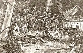 As Decatur approached the berthed Philadelphia he encountered a light wind that made his approach tedious. He had to casually position his ship close enough to Philadelphia to allow his men to board while not creating any suspicion. When the two vessels were finally close enough, Catalano obtained permission for Decatur to tie Intrepid to the captured Philadelphia. Decatur surprised the few Tripolitans on board when he shouted the order "board!", signaling to the hidden crew below to emerge and storm the captured ship.[57] Without losing a single man, Decatur and 60 of his men, dressed as Maltese sailors or Arab seamen and armed with swords and boarding pikes, boarded and reclaimed Philadelphia in less than 10 minutes, killing at least 20 of the Tripolitan crew, capturing one wounded crewman, and forcing the rest to flee by jumping overboard. Only one of Decatur's men was slightly wounded by a sabre blade. There was hope that the small boarding crew could launch the captured ship, but the vessel was in no condition to set sail for the open sea. Decatur soon realized that the small Intrepid could not tow the larger and heavier warship out of the harbor. Commodore Preble's order to Decatur was to destroy Philadelphia where she berthed as a last resort, if she was unseaworthy. With the ship secure, Decatur's crew began placing combustibles about Philadelphia with orders to set her ablaze. After making sure the fire was large enough to sustain itself, Decatur ordered his men to abandon the ship and was the last man to leave.[58] As the flames intensified, the guns aboard Philadelphia, all loaded and ready for battle, became heated and began discharging, some firing into the town and shore batteries, while the ropes securing the ship burned off, allowing the vessel to drift into the rocks at the western entrance of the harbor.[59]