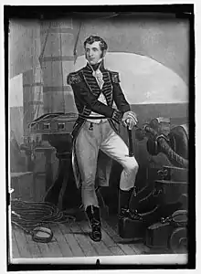 Stephen Decatur Jr. (/dɪˈktər/;[1] January 5, 1779 – March 22, 1820) was a U.S. naval officer and commodore. He was born on the eastern shore of Maryland in Worcester County. His father, Stephen Decatur Sr., was a commodore in the United States Navy who served during the American Revolution; he brought the younger Stephen into the world of ships and sailing early on. Shortly after attending college, Decatur followed in his father's footsteps and joined the U.S. Navy at the age of nineteen as a midshipman.[2][3]