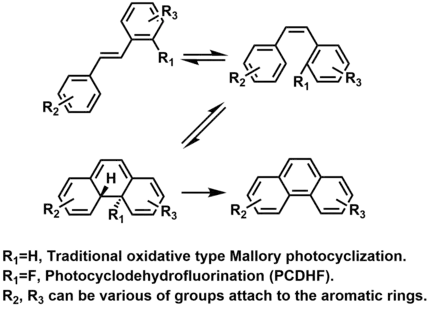In 2015, Li and Twieg reported a novel derivative of Mallory type photocyclizations and named it as photocyclodehydrofluorination (PCDHF). In the cyclization a stilbene (or ortho-terphenyl) with a pentafluorophenyl group, the fluorine atom can be used as a facile leaving group.[17]