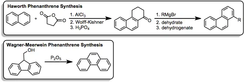 Several other methods are available to synthesize the phenanthrene ring system; however, most of these are longer or less functional group tolerant than photocyclization. The Haworth reaction and the Wagner-Meerwein-type ring-expansion are two such alternatives.[19]
