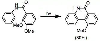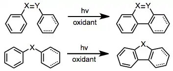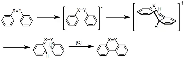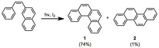 Under UV irradiation, stilbene and its derivatives undergo intramolecular cyclization to form dihydrophenanthrenes. In the presence of an oxidant, the dihydrophenanthrenes aromatize to give polycyclic aromatics. Typically, the dihydrophenanthrenes themselves are relatively unstable, and revert to cis-stilbenes in the absence of a hydrogen-trapping agent. Suitably substituted stilbenes may undergo irreversible, rearomatizing elimination or [1,n]-shift processes in the absence of an oxidant. Aryl enynes,[4] heteroatomic stilbene derivatives (e.g. amides[5]), and substrates containing a single heteroatom in place of the stilbene double bond[6] also undergo the reaction.