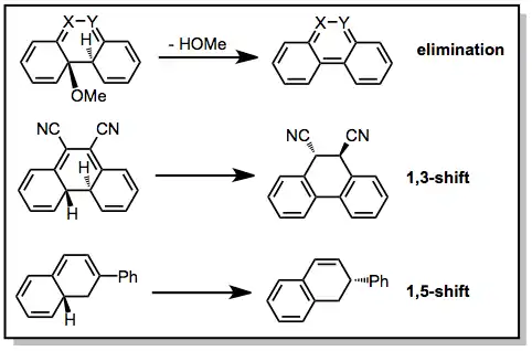 For most substrates, in the absence of an oxidant, the dihydrophenanthrene intermediate may reversibly open to the corresponding cis-stilbene. However, suitably substituted stilbenes cyclize irreversibly if an aromatizing elimination or hydrogen shift process can take place. Examples of these transformations are provided below.[8][9][10]