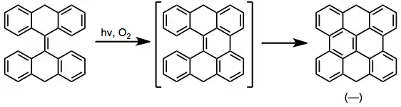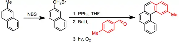 Photocyclization can be used as the final step of a sequence to generate a fused aromatic ring at a benzylic position. After benzylic bromization with N-bromosuccinimide, transformation to the phosphonium salt, and a Wittig reaction with anaromatic aldehyde, photocyclization fuses the aromatic rings. Iteration of this sequence results in helicenes.[18]