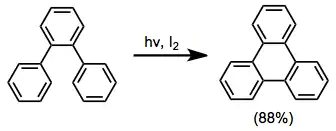 ortho-Terphenyl substrates cyclize to the corresponding triphenylenes in the presence of an oxidant, such as iodine. Oxygen is unsatisfactory because ring-opening to highly stabilized terphenyl is faster than oxidation when oxygen is used.[13]
