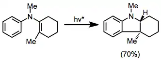 Cyclization of arylvinyl- or diarylamines provides indolines and carbazoles, respectively. In one interesting example, the use of circularly polarized light provided 3 in slight enantiomeric excess.[16]