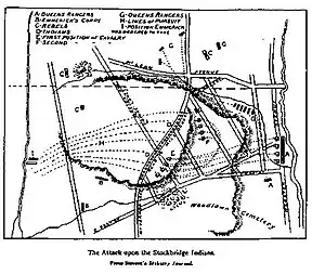 In August 1778, the Stockbridge Militia was stationed at an outpost in what is now the Bronx, just north of Manhattan.[3] They were attached to a newly formed Light Infantry Corps commanded by Continental Army general Mordecai Gist. The Queen's Rangers, a Loyalist military unit under the command of Lieutenant Colonel John Graves Simcoe, led an attack on the Stockbridge Militia in what became known as the Battle of Kingsbridge[4] Cortlandt Ridge,[5] Van Cortlandt's Woods,[6] or The Stockbridge Massacre.[3] The Queen's Rangers were developed from Rogers' Rangers, a provincial unit in which many Stockbridge Indians had served during the French and Indian War.