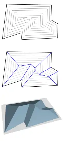 Each point within the input polygon can be lifted into three-dimensional space by using the time at which the shrinking process reaches that point as the z-coordinate of the point. The resulting three-dimensional surface has constant height on the edges of the polygon, and rises at constant slope from them except for the points of the straight skeleton itself, where surface patches at different angles meet. In this way, the straight skeleton can be used as the set of ridge lines of a building roof, based on walls in the form of the initial polygon.[2][14] The bottom figure in the illustration depicts a surface formed from the straight skeleton in this way.