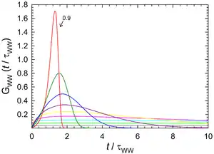 Following the usual physical interpretation, we interpret the function argument t as time, and fβ(t) is the differential distribution. The area under the curve can thus be interpreted as a mean relaxation time. One finds