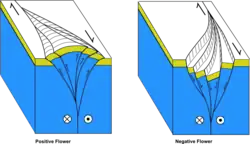 In detail, many strike-slip faults at surface consist of en echelon and/or braided segments, which in many cases were probably inherited from previously formed Riedel shears. In cross-section, the displacements are dominantly reverse or normal in type depending on whether the overall fault geometry is transpressional (i.e. with a small component of shortening) or transtensional (with a small component of extension). As the faults tend to join downwards onto a single strand in basement, the geometry has led to these being termed flower structure. Fault zones with dominantly reverse faulting are known as positive flowers, while those with dominantly normal offsets are known as negative flowers. The identification of such structures, particularly where positive and negative flowers are developed on different segments of the same fault, are regarded as reliable indicators of strike-slip.[8]