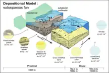 Subaqueous fan deposits are generally described as coarse to fine gravel and/or sand, with variable texture and sorting. Underflows (meltwater denser than lake water) tends to produce subaqueous fans with channels and levees.[3] Subaqueous fans can be formed by the influence of glacier movement and by underwater currents typically found at a river delta. The sediment size and composition that makes up the subaqueous fan is dependent on the type of rock that the water flow or glacial ice sheet moves over. Sedimentary structures found in subaqueous fans are heavily dependent on the strength of the water flow.[4]