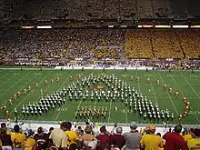 The Sun Devil Marching Band (SDMB), also known as The Pride of the Southwest, is the athletic band of Arizona State University in Tempe, Arizona. The Sun Devil Marching Band motto is “Expect Great Things.” The acronym EGT is inscribed on a sign that hangs from the director's podium towering over the band's practice field, and is a symbol of the high standards that band members strive to meet.[1] The ASU Band program, which includes the Marching, Pep, and Dixieland bands, is a part of the Sun Devil Athletics department. The band is currently under the direction of Director of Athletic Bands James G. "The Hammer" Hudson, who took over the program in 2006.[2] The Sun Devil Marching Band is a major ambassador for Arizona State University and the state of Arizona. Each year almost 500,000 people are entertained by the band, which plays at home football at Sun Devil Stadium and as a pep band for basketball games at Wells Fargo Arena, homecoming, bowl game parades, other community events in the Valley, across the country, and even abroad.