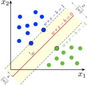 Maximum-margin hyperplane and margins for an SVM trained with samples from two classes. Samples on the margin are called the support vectors.