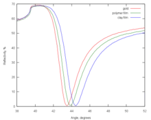 Surface plasmons have been used to enhance the surface sensitivity of several spectroscopic measurements including fluorescence, Raman scattering, and second-harmonic generation. In their simplest form, SPR reflectivity measurements can be used to detect molecular adsorption, such as polymers, DNA or proteins, etc. Technically, it is common to measure the angle of minimum reflection (angle of maximum absorption). This angle changes in the order of 0.1° during thin (about nm thickness) film adsorption. (See also the Examples.) In other cases the changes in the absorption wavelength is followed.[8] The mechanism of detection is based on the adsorbing molecules causing changes in the local index of refraction, changing the resonance conditions of the surface plasmon waves. The same principle is exploited in the recently developed competitive platform based on loss-less dielectric multilayers (DBR), supporting surface electromagnetic waves with sharper resonances (Bloch surface waves).[9]