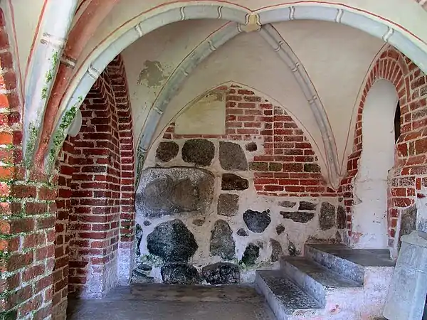 In the Church in Altenkirchen (10 kilometres (6.2 mi) from Arkona), in the 13th-century wall of the sacristy, there is a granite slab measuring 1.19 × 1.68 m depicting a man with a moustache, wearing a cap and a long robe, holding a large horn. The slab is dated to the 10th-11th centuries, although it was not set into the wall until the 13th century or later;[28] according to David Chytraeus, the stone was already there in 1586 and was called Jaromirstein ("Jaromir's stone").[83] In the 18th century the slab was surrounded by the black painted inscription Sanctus Vitus oder Svantevit ("St. Vitus or Svantevit"), nowadays almost completely erased. Chytraeus, following a local legend, believed the slab to be a representation of Svetovit – a belief that persisted in Rügen folk tradition until the 19th century.[83]