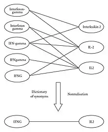 The language in scientific articles often include ambiguities, and an important step for coeherent parsing of the literature is the extraction of the sense of each term in the context they are used, a task called Word-sense disambiguation (WSD).[59] For example, terms for genes like CT (PCYT1A) called and MR (NR3C2) can be confused with the acronyms for Computational Tomography and Magnetic Resonance, requiring sofisticated disambiguation systems.[60] Terms are often reconciled to ontologies or other sources of unique identifiers, such as the Unified Medical Language System (UMLS).[61] This process of mapping multiple different utterances to a single name or identifier is called normalization.[57]