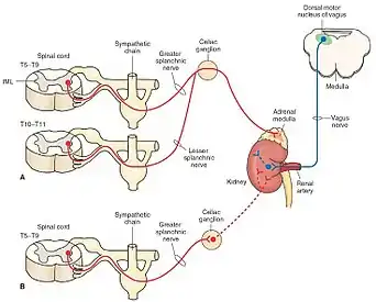 The sympathoadrenal system is a physiological connection between the sympathetic nervous system and the adrenal medulla and is crucial in an organism's physiological response to outside stimuli.[1] When the body receives sensory information, the sympathetic nervous system sends a signal to preganglionic nerve fibers, which activate the adrenal medulla through acetylcholine. Once activated, norepinephrine and epinephrine are released directly into the blood by postganglionic nerve fibers where they act as the bodily mechanism for "fight-or-flight" responses. Because of this, the sympathoadrenal system plays a large role in maintaining glucose levels, sodium levels, blood pressure, and various other metabolic pathways that couple with bodily responses to the environment.[1] During numerous diseased states, such as hypoglycemia or even stress, the body's metabolic processes are skewed. The sympathoadrenal system works to return the body to homeostasis through the activation or inactivation of the adrenal gland. However, more severe disorders of the sympathoadrenal system such as Pheochromocytoma (a tumor on the adrenal medulla) can affect the body's ability to maintain a homeostatic state. In these cases, curative agents such as adrenergic agonists and antagonists are used to modify epinephrine and norepinephrine levels released by the adrenal medulla.[2]