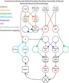 Synthetic Nervous System (SNS) is a computational neuroscience model that may be developed with the Functional Subnetwork Approach (FSA) to create biologically plausible models of circuits in a nervous system.[1] The FSA enables the direct analytical tuning of dynamical networks that perform specific operations within the nervous system without the need for global optimization methods like genetic algorithms and reinforcement learning. The primary use case for a SNS is system control, where the system is most often a simulated biomechanical model or a physical robotic platform.[2][3][4][5][6][7][8] An SNS is a form of a neural network much like artificial neural networks (ANNs), convolutional neural networks (CNN), and recurrent neural networks (RNN). The building blocks for each of these neural networks is a series of nodes and connections denoted as neurons and synapses. More conventional artificial neural networks rely on training phases where they use large data sets to form correlations and thus “learn” to identify a given object or pattern. When done properly this training results in systems that can produce a desired result, sometimes with impressive accuracy. However, the systems themselves are typically “black boxes” meaning there is no readily distinguishable mapping between structure and function of the network. This makes it difficult to alter the function, without simply starting over, or extract biological meaning except in specialized cases.[9][10] The SNS method differentiates itself by using details of both structure and function of biological nervous systems. The neurons and synapse connections are intentionally designed rather than iteratively changed as part of a learning algorithm.