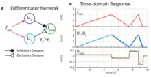 Differentiation networks are nearly the same as subtraction networks with an added dynamical component. The presynaptic neuron that inhibits the postsynaptic neuron is modelled as a physically larger neuron which means it has a greater capacitance than the excitatory synapsing neuron. This increased capacitance results in a neuron that is slower to reach its fully excited state (ie. ). Subtracting the slow responding neuron signal (with the inhibitory synapse) from the fast responding signal is basically a biological version of numerical differentiation whereby a previous time-“step” is subtracted from the current time-“step”. This network is good for identifying changes in applied current to a network or applied stimulus to a sensory neuron. The equations that detail this behavior are presented in.[1]