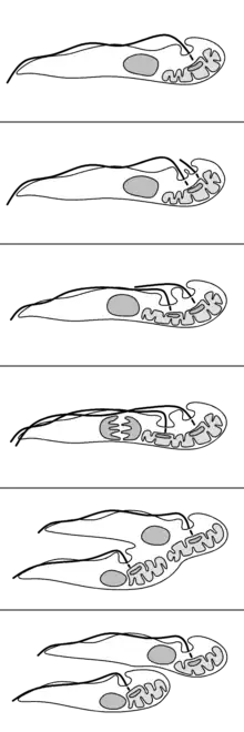 The procyclic trypomastigotes cross the peritrophic matrix, undergo slight elongation and migrate to the anterior part of the midgut as non-proliferative long mesocyclic trypomastigotes. As they reach the proventriculus, they became thinner and undergo cytoplasmic rearrangement to give rise to proliferative epimastigotes.[76] The epimastigotes divide asymmetrically to produce long and short epimastigotes. The long epimastigote cannot move to other places and simply die off by apoptosis.[78][79] The short epimastigote migrate from the proventriculus via the foregut and proboscis to the salivary glands where they get attached to the salivary gland epithelium.[57] Even all the short forms do not succeed in the complete migration to the salivary glands as most of them perish on the way–only up to five may survive.[76][80]