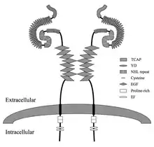 The extracellular C terminal domain is composed of a linker region, EGF-like repeats and then a globular domain. The linker region is made up of ~200 amino acid residues and is found immediately distal to the transmembrane domain. This is followed by eight phylogenetically conserved tenascin C-type EGF-like repeats, which features the uniquely conserved replacement of a single cysteine in repeats 2 and 5 in place of the original tyrosine and phenylalanine residues respectively. Since cysteines are susceptible to forming disulfide bonds, the single cysteines at the EGF-like repeats of a teneurin molecule can facilitate the homophilic and heterophilic dimerisation of teneurin family molecules.[14] More distally is the globular domain consisting of a 700-800 amino acid residue region. There are 17 conserved cysteine residues, a region of NHL repeats, a region of 26 YD residue repeats, and then a teneurin C-associated peptide (TCAP). The YD repeats are rich in N-linked glycosylation and were previously only reported in the rhs element of bacteria.[19][20] The TCAP is the resulting peptide from cleaving a putative furin cleavage site found immediately on the N-terminal of TCAP. The furin cleavage site is rich in tyrosine residues and consists of 4 conserved cysteine residues. The 4 cysteine residues assist in protein folding, however, they are absent in Ten-m2 and Ten-m3. There are 41 amino acids in TCAPs, except for TCAP-3 from Ten-m3, which has 40.[21] TCAPs show structural homology to the CRF family molecule and appears to influence neurite outgrowth and some behaviours relating to stress and anxiety.[9][10]