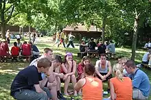 The Taizé Community attempts to send pilgrims back from youth meetings to their local churches, to their parishes, groups or communities, to undertake, with many others, a "Pilgrimage of Trust on Earth."[22] Every year around New Year (usually from 28 December to 1 January), a meeting in a large European city attracts several tens of thousands of young adults.[23][24] It is organized by brothers of the Taizé Community, sisters of St. Andrew, and young volunteers from all over Europe, and from the host city. The participants stay with local families or in very simple group accommodations. In the morning, they take part in a program organized by the parish closest to their accommodation. For their midday meal, all participants travel to a central location, usually the local exhibition halls. The meal is followed by a common prayer, and the afternoon is spent in workshops covering faith, art, politics and social topics. In the evening, everyone meets again for the evening meal and an evening prayer.