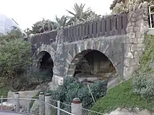 The "Rustic Bridge" was opened in 1915 and was one of Taronga Zoo's earliest landscape features. It was the main way in which visitors could cross the natural gully that it spans. Early photographs show it as a romantic pathway secluded by plantings. The rustic effect was created by embedding stones in the wall and like the aquarium, its design was reminiscent of Italian grottoes.