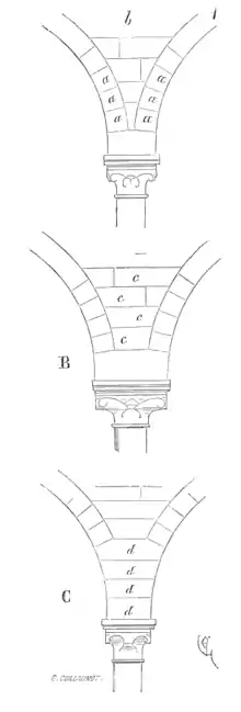 In architecture, tas-de-charge is a French term, also used in English, given to the lower courses of ribs of a Gothic vault, which are laid in horizontal courses and bonded into the wall, forming a solid mass. This helps bond the ribs, vault and walls together. They generally rise about one-third of the height of the vault, and as they project forwards they lessen the span to be vaulted over.[1]