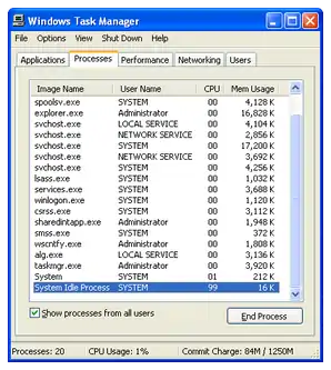 The Processes tab shows a list of all running processes on the system. This list includes Windows Services and processes from other accounts. The Delete key can also be used to terminate processes on the Processes tab. By default, the processes tab shows the user account the process is running under, the amount of CPU, and the amount of memory the process is currently consuming. There are more columns that can be shown. The Processes tab divides the process into three categories: