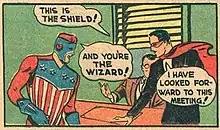 The first team-up between characters published in different comics from the same publisher was published in 1940 by the MLJ Comics. Pep Comics #4, by Harry Shorten and Irv Novick, featured a story with the Shield, which was continued in Top Notch Comics #5, by Will Harr and Edd Ashe. In that comic, the Shield met the Wizard. Timely Comics would follow, with a team-up between Sub-Mariner and Human Torch. National Comics Publications took the team-up concept one step further and created the Justice Society of America, the first superhero group, composed of superheroes who starred their own comic books.[2] In international comics, the Phantom teamed up with Zigomar in 1939.[3]